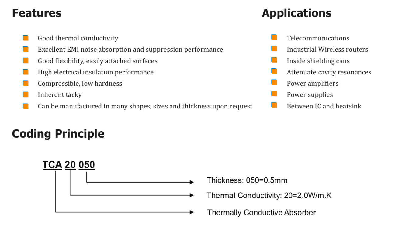TM TCA系列導熱吸收材料是一種填充陶瓷和鐵氧體顆粒的硅基復合材料。設計用于吸收電磁噪聲(諧振腔、串擾和耦合)并填充熱界面之間的間隙。TCA系列吸收材料具有自粘性,組裝時不需要任何膠帶。" />