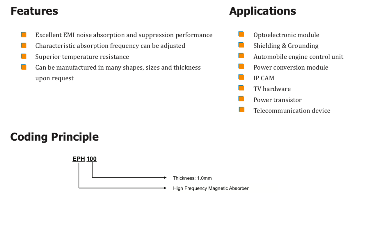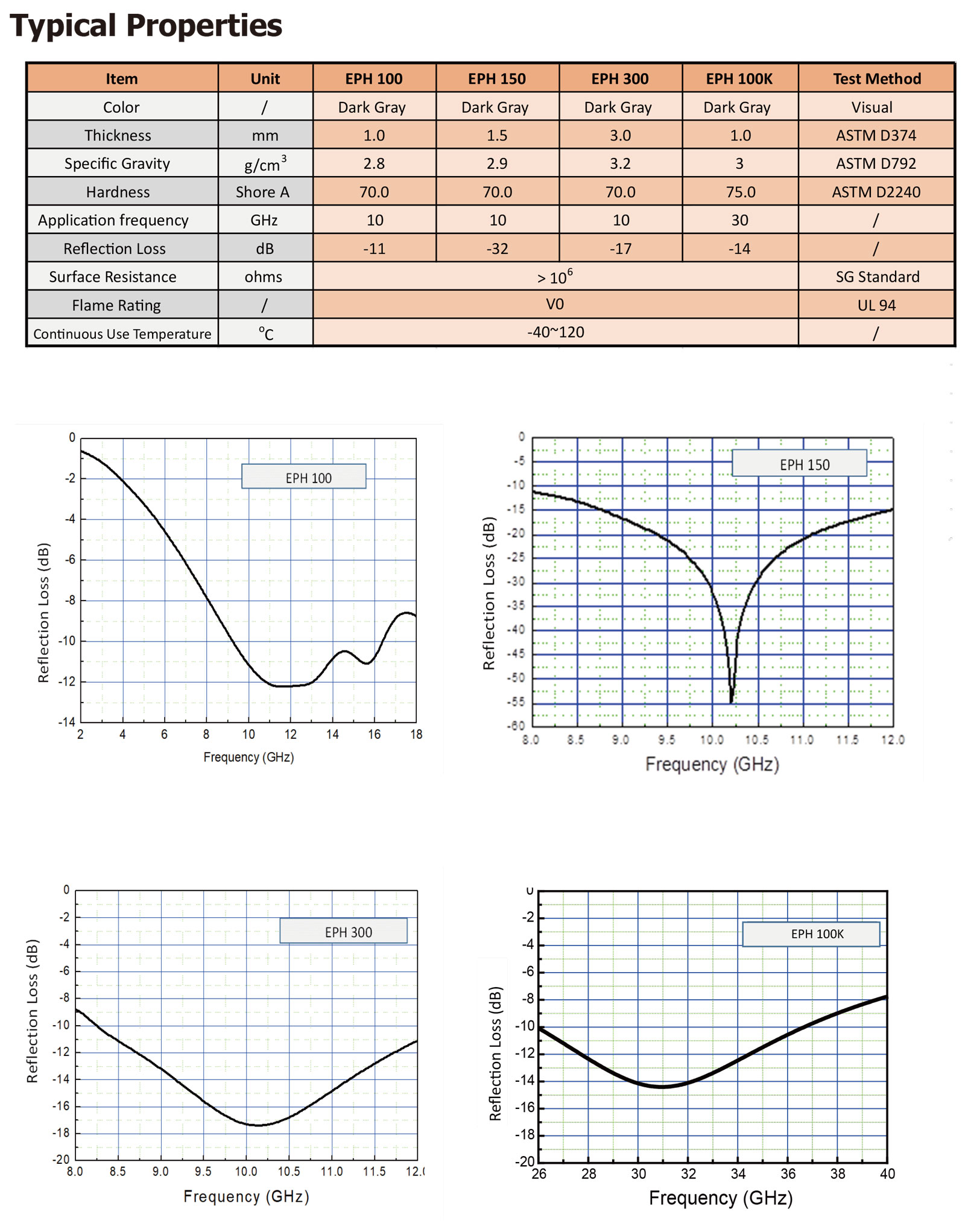 TM EPH系列是一種由高磁導率合金粉末和橡膠混合、分散、壓制而成的高頻吸收材料。該材料可以通過絕緣損耗、磁損耗和阻抗損耗將電子設(shè)備發(fā)射的電磁波轉(zhuǎn)化為熱能來減少電磁輻射。" />
