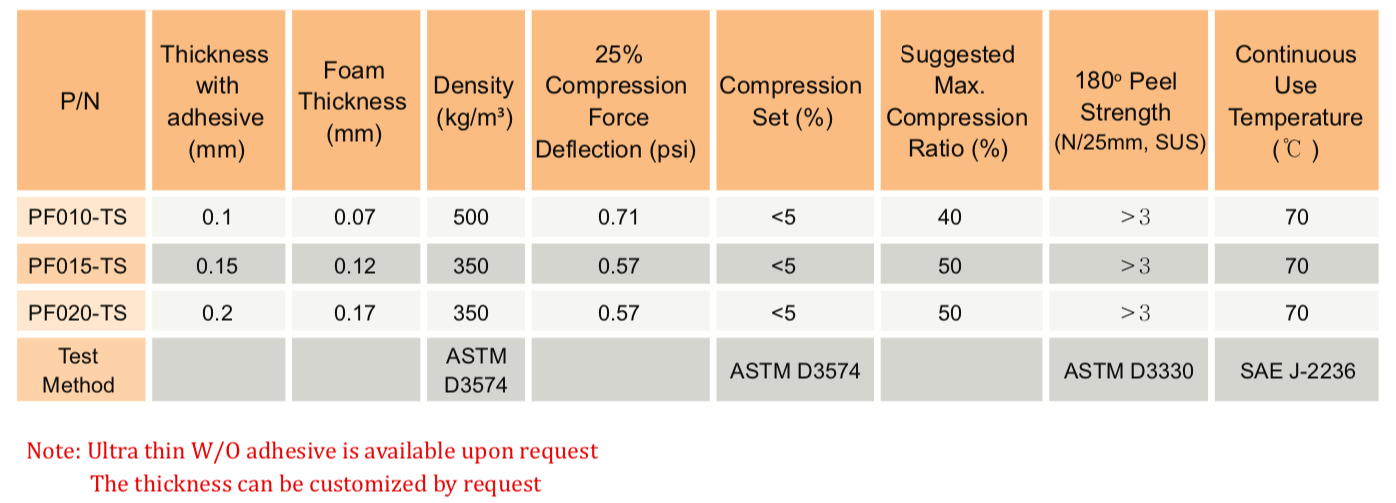 TM PF-TS系列是一種超薄、高性能的泡棉,用于電子設備的緩沖、保護性密封和長期間隙填充。PF-TS系列具有極低的壓縮永久變形、高密封性能和優(yōu)異的沖擊吸收性能。標準顏色為黑色,可根據(jù)要求提供其他顏色。PF-TS系列涂有壓花微通道粘合劑,以便在應用過程中從粘合劑和基材之間排出空氣。" />