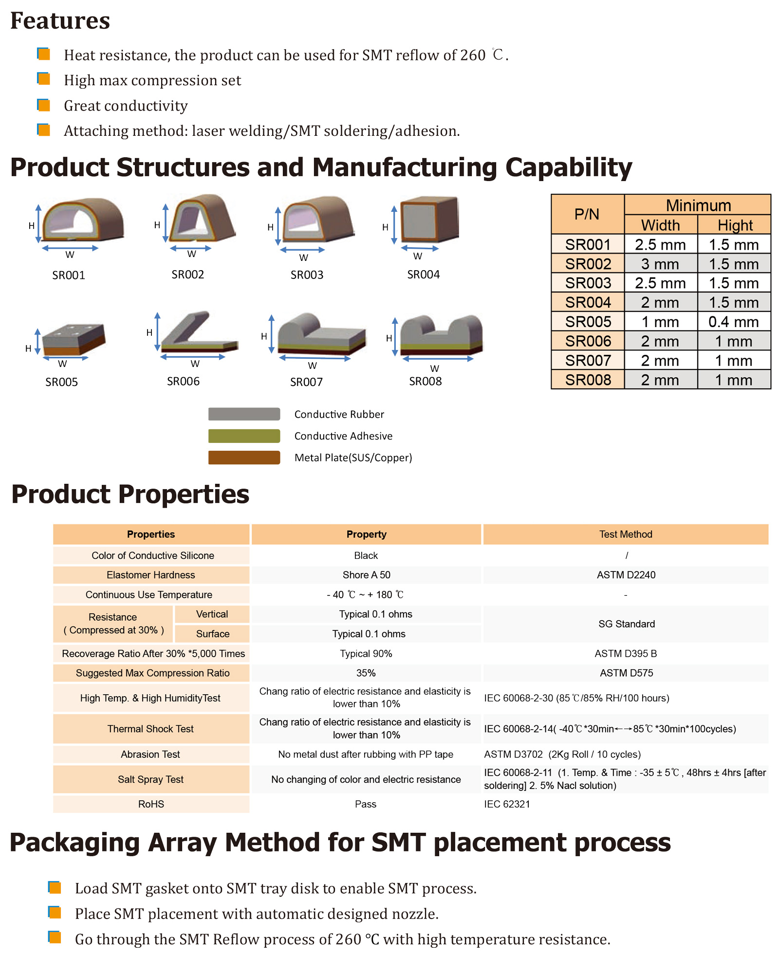 TM SR 系列 SMT橡膠墊圈呈矩形,寬度較窄,設計用于接地 用于PCB和FPCB的焊盤或連接器,可以大大降低電子產品的EMI/RF噪聲。它是一種可回流焊接的彈性導電介質,可通過SMT安裝在PCB和FPCB上。" />